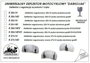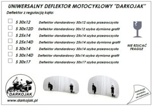 Okazuje się że w przypadku deflektorów DARKOJAK wystarczają tylko 4 wielości wymiarowe szybek (wersje klasyczne i nowoczesne ewolution) w dwóch rodzajach uchwytów (podwójne z regulacja kąta lub pełną regulacją – opcjonalnie centralny uchwyt).